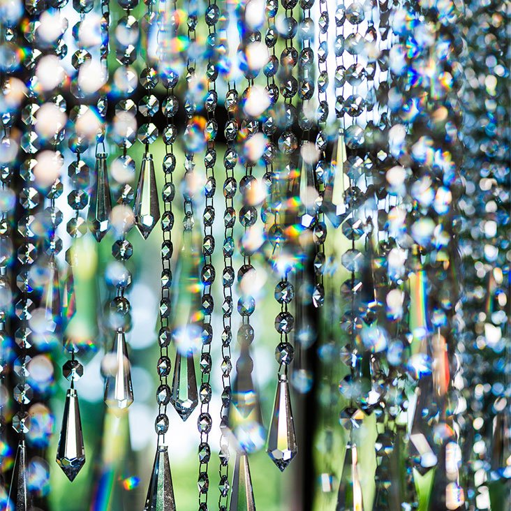 Потолочный светильник, бра или торшер с каркасом из хромированной стали (08). Абажур из стеклянных подвесок. Лампочки включены.