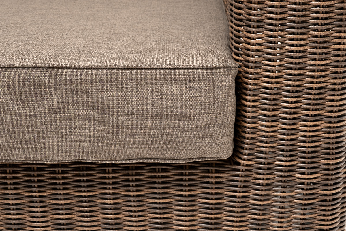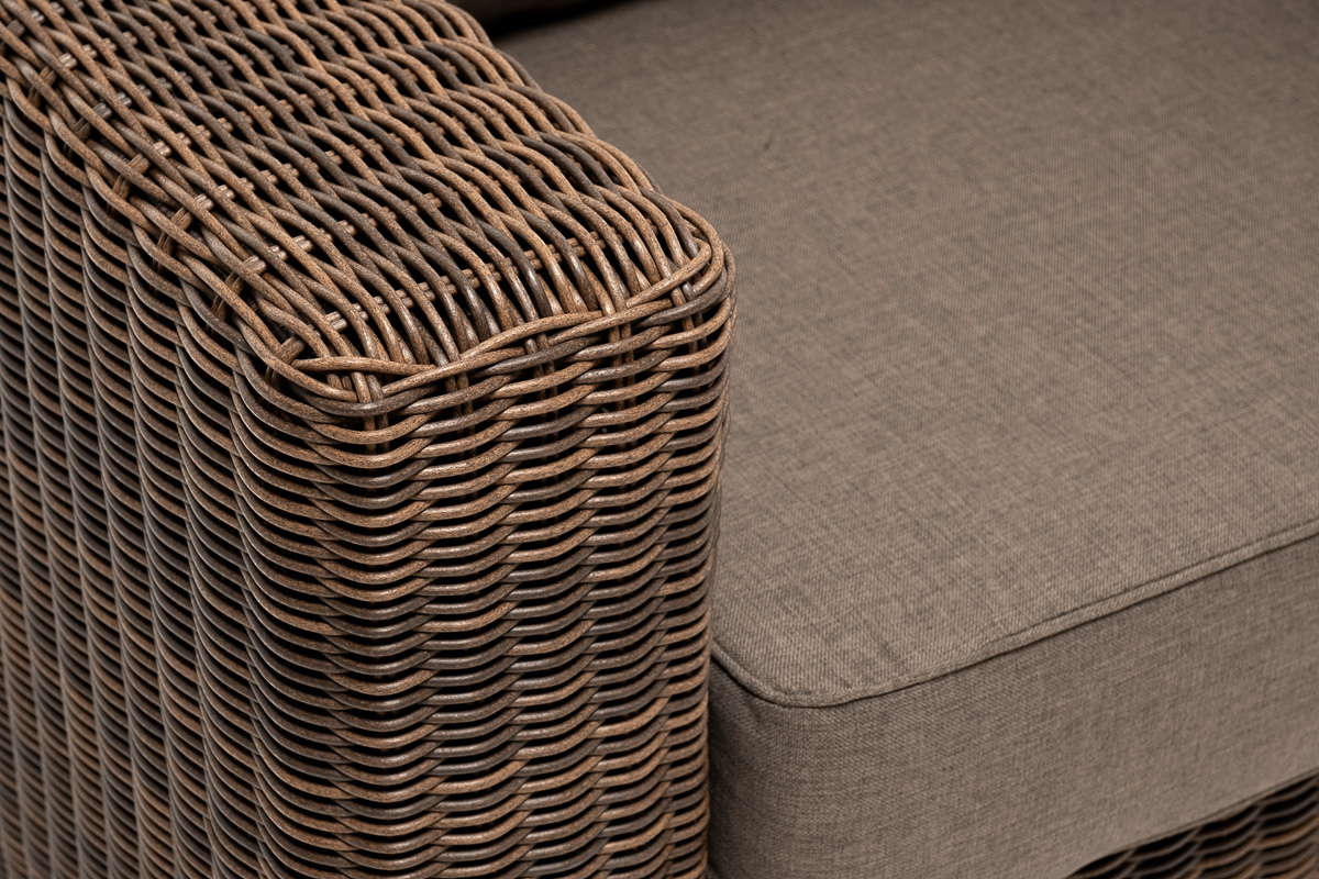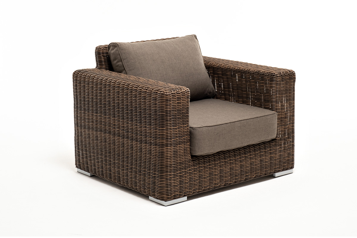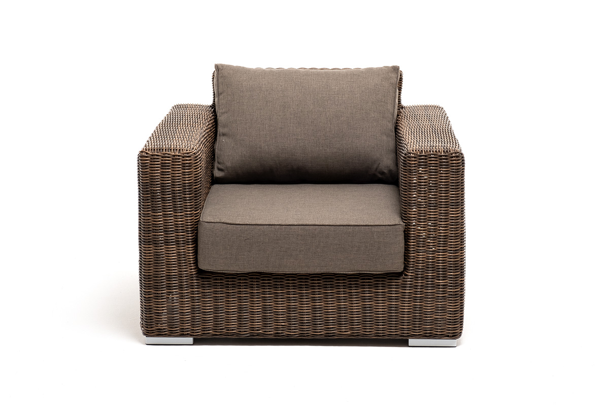 Кресло оснащено каркасом из прочного алюминия, ручное круглое плетение является основным декоративным элементом мебели. Оно выполнено из искусственного ротанга в коричневом цвете.