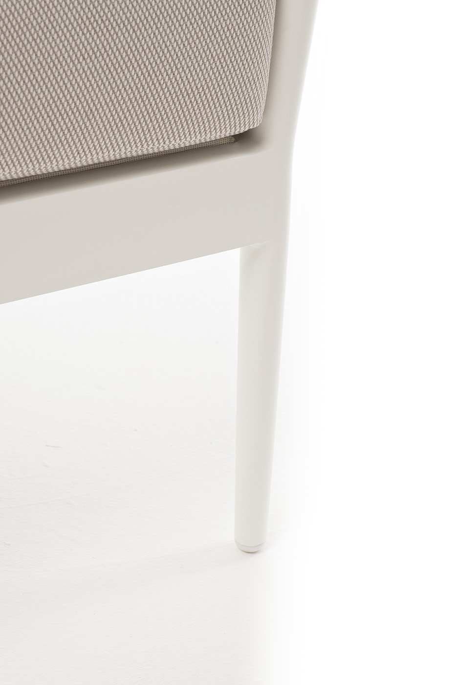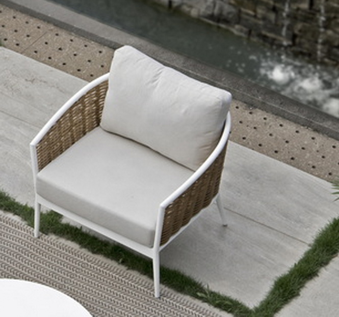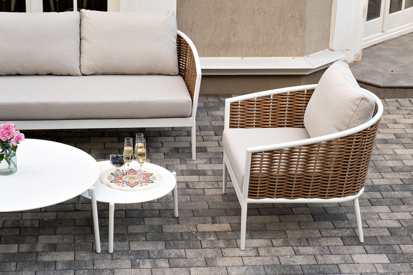 Плетеная мебель дополнена удобными подушками в бежевых чехлах. При их изготовлении используют полиэстер, плотность – 300гр/м2. Он обрабатывается влагоотталкивающей пропиткой для повышения защитных свойств материала.