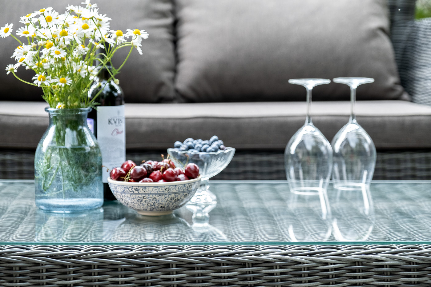 Кресла и диван идут в комплекте с подушками с серо-коричневыми чехлами. Они пошиты из качественного полиэстера с плотностью 230гр/м2. Материал предварительно проходит обработку влагоотталкивающей пропиткой. Столик дополнен практичной столешницей из стекла толщиной 5 мм.