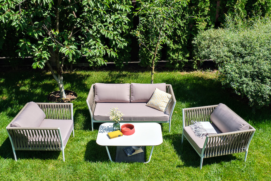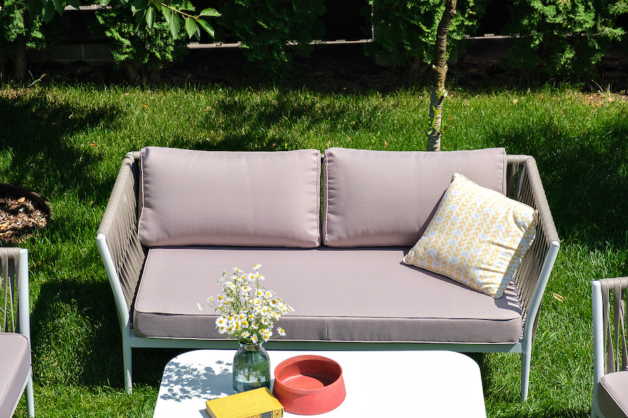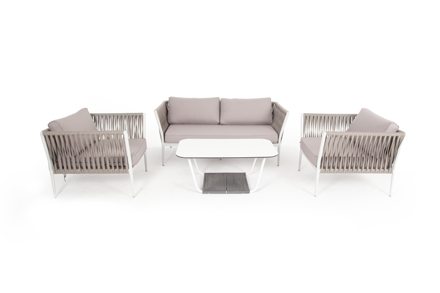 Диван и кресла изготовлены их алюминиевого прочного каркаса, оплетенного ручным способом роупом серо-коричневого цвета. Это эластичные ленты из полиэфирных волокон высокого качества.