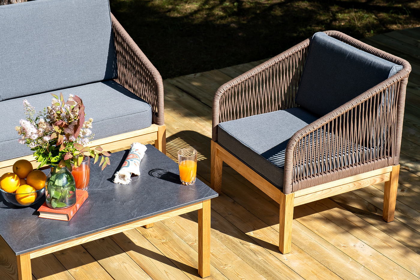 "Канны" лаунж-зона 4-местная из роупа со столиком "Канны" (серый гранит), основание дуб, роуп коричневый