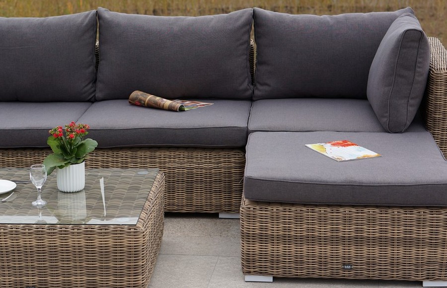 Габариты составляют - 740×860×650 мм, в комплект входят подушки серо-коричневого цвета.