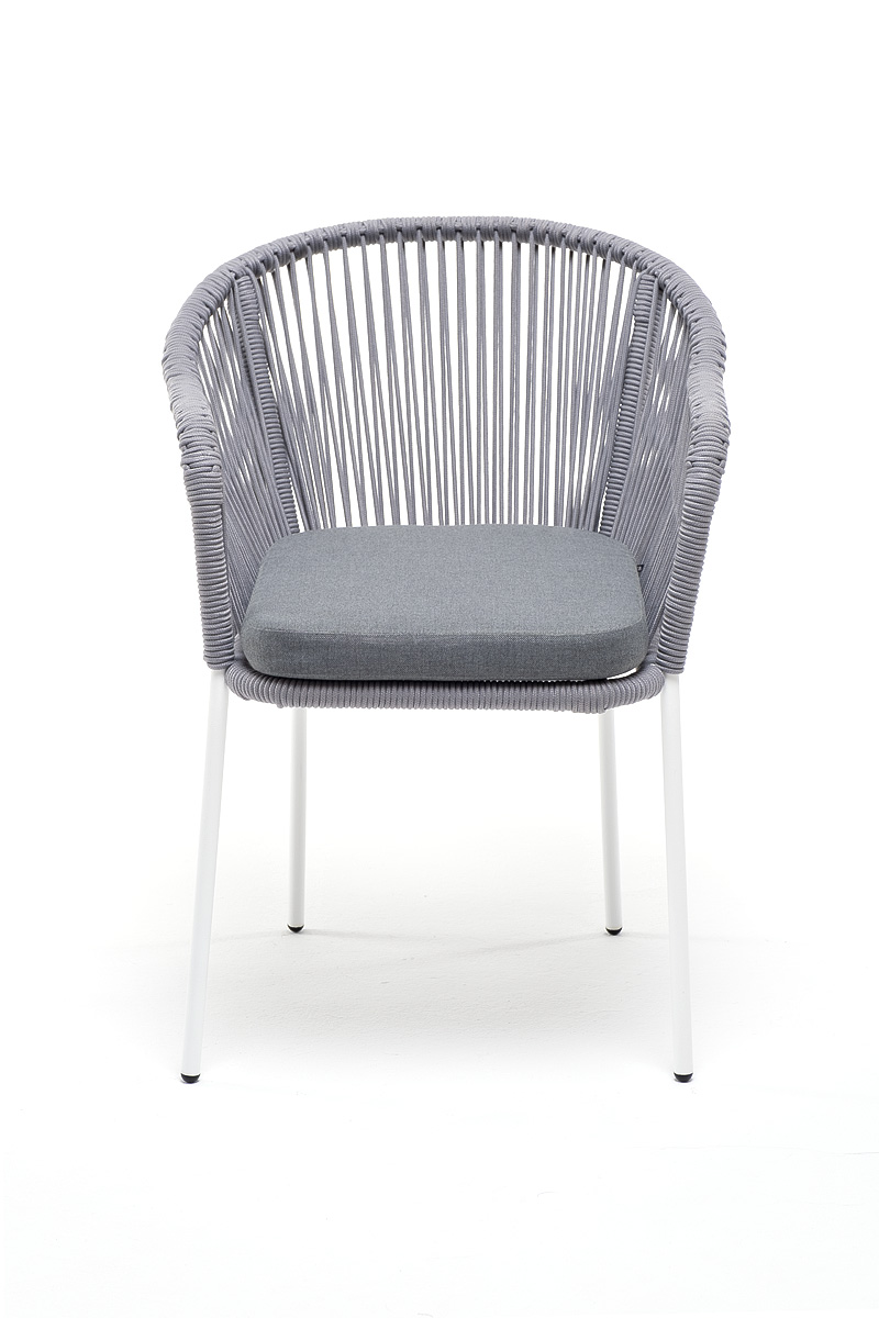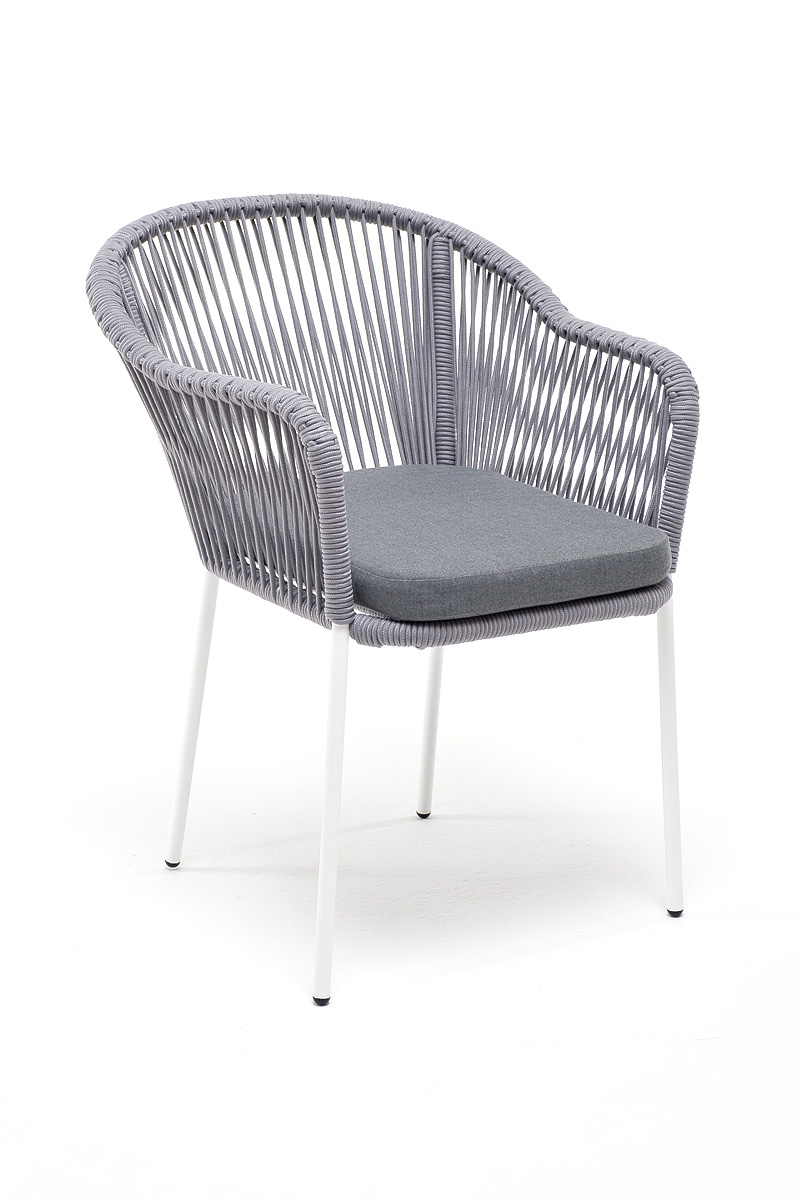 "Лион" стул плетеный из роупа, каркас из стали белый муар, роуп светло-серый круглый, ткань светло-серая