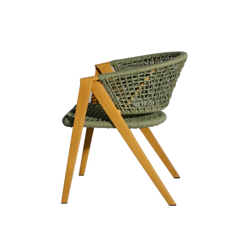 Изготовлен из алюминиевого каркаса, оплетенного вручную эластичными синтетическими лентами из высокопрочных полиэфирных волокон. Роуп является гипоаллергенным, прочным, износостойким и устойчивым к ультрафиолету. Приятный на ощупь и напоминает шерстяное плетение. Цвет каркаса – «под дерево», оплетки - зеленый. На ножках стула идут черные пластиковые наконечники (заглушки).